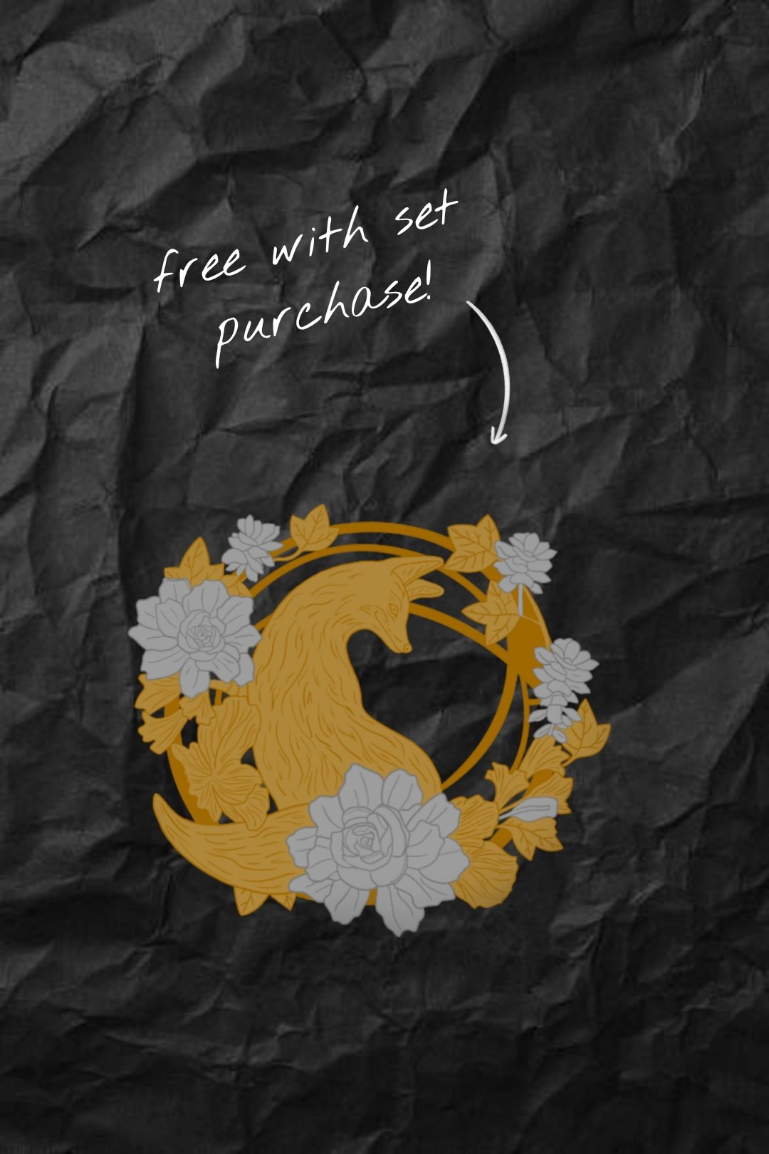 By PREORDERING a set, you also receive a p4p 2 inch pin of the fox brooch (dual metal antique gold and antique silver, recessed, no enamel colors). Extras of the brooch will be available in hand for p4p price.